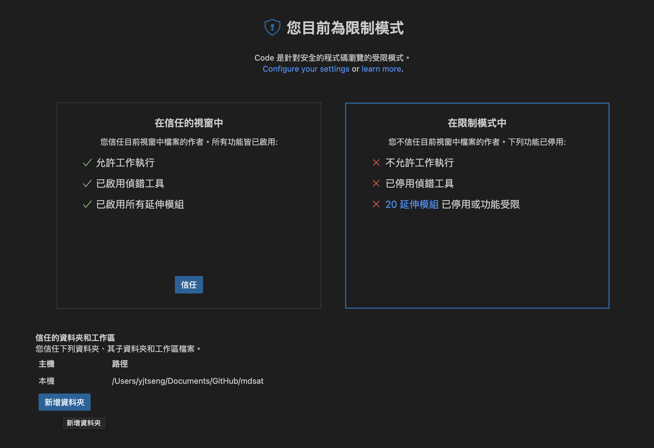 Click trust and add the folder with codes in the trust workspace